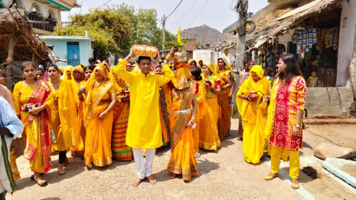 वैदिक पूजन पाठ के बाद मुख्य यजमान के आवास से गाजे बाजे के साथ भव्य कलश यात्रा निकाली गई नगर के प्राचीन बिहारी जी मंदिर सहित शिवालयों और देवी मंदिरों में पूजा अर्चना की गई। बड़ी संख्या में पीत वस्त्र धारण किए व सिर में कलश धारण कर महिलाएं शोभायमान हो रहीं थीं।