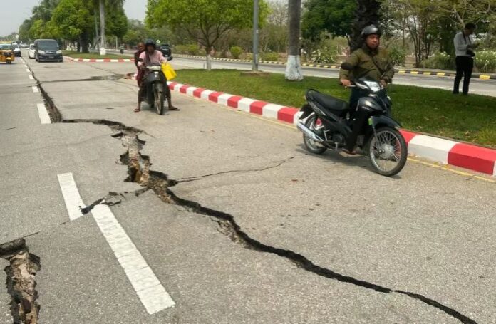 28 मार्च, 2025 को मध्य म्यांमार में भूकंप के बाद नेपीडॉ में एक सड़क पर दरारें देखी गईं।